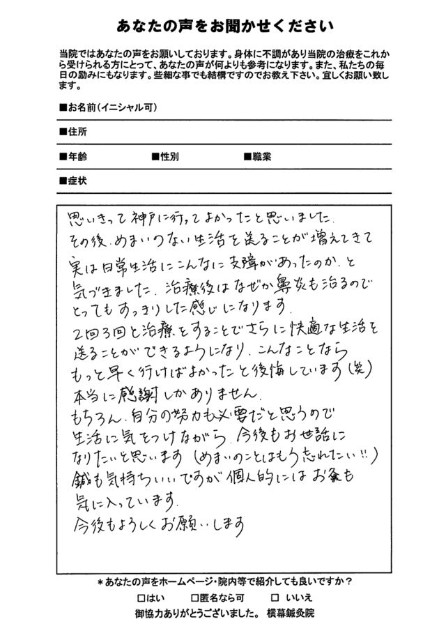 2回3回と治療をすることでさらに快適な生活を送ることができるようになり、こんなことなら もっと早く行けばよかったと後悔しています(笑)