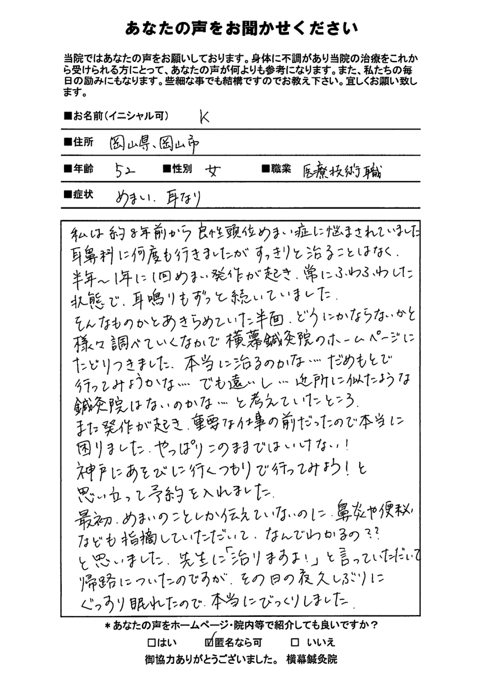 鍼治療を一度もした事がなく少し不安でしたが、先生の治療院を訪れてとても安心致しました。静かで美しくゆき届いた院内、横幕先生初めスタッフの皆様の優しく誠実な対応、ほんとうに安心致しました。腰痛も慢性的にあり、先生にお話ししました。先生はくわしくていねいに説明して下さり、耳鳴は治るのに時間がかかる事をおっしゃって下さいました。